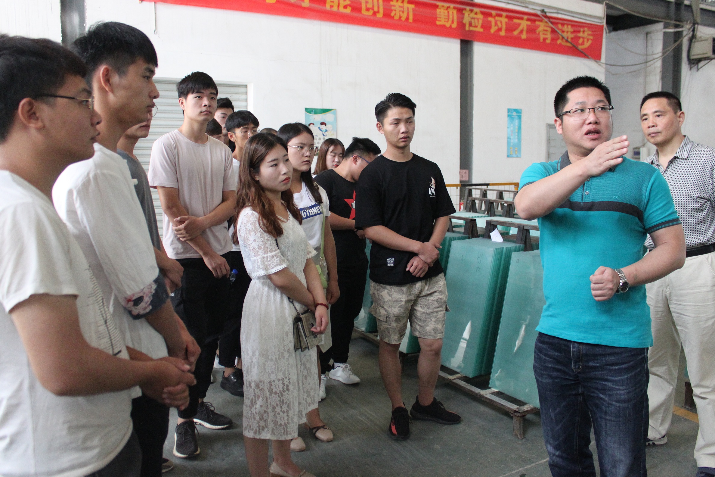 彩晶事業部長魏常宏的帶領下,綜合管理部葉、行政經理馬向明的陪同下,我們來到了參觀的第一站:彩晶事業部制一部生產車間。魏部長細心的給同學們講解,并讓同學們看到了每一片玻璃從進廠、到切割、加工、打磨、水洗,到合格的離開這個廠區。車間機械的轟鳴聲,絲毫不減同學們的興趣與激情,同學們緊跟著隊伍,仔細的觀看,認真的聆聽,雖然聽得也只是只字片語,但從同學們頻頻點頭可以看出,同學們都心領神會。
